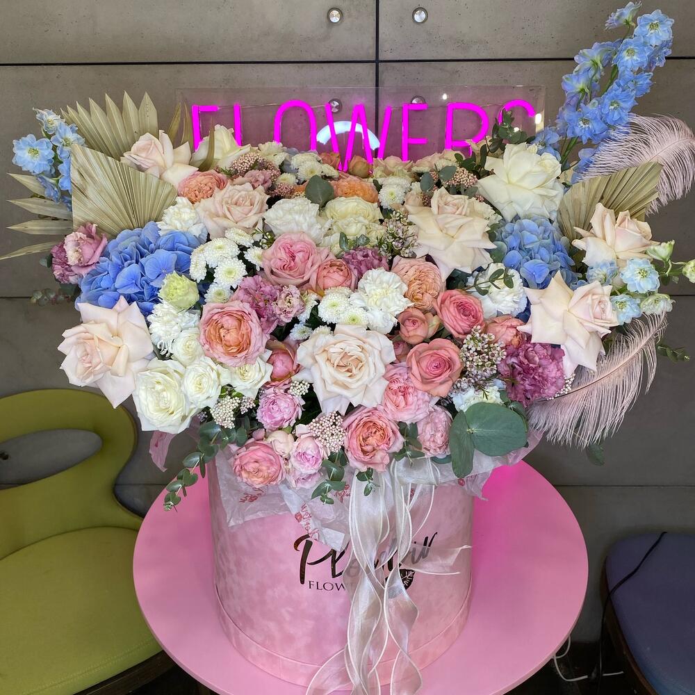 Гортензия – 3 шт.Дельфиниум – 3 шт.Хризантема Сантини – 10 шт.пальма сухоцвет – 4 шт.перо декоративное – 3 шт.Роза Мента – 15 шт.Озотамнус – 5 шт.плая бланка роза – 10 шт.Пионовидная роза pink o’hara – 9 шт.Ваксфлауэр – 5 шт.махровый лизиантус розовый – 7 шт.Пионовидная роза джульетта – 10 шт.Роза кустовая – 10 шт.Диантус – 9 шт.Роза кустовая жанин – 5 шт.