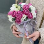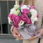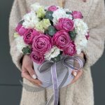 Коробка шляпная – 1 шт. Оазис флористический – 1 шт. пионовидная роза misty bubbles – 6 шт. Эустома – 4 шт. Эвкалипт – 2 шт. Оформление атласная лента – 1 шт.