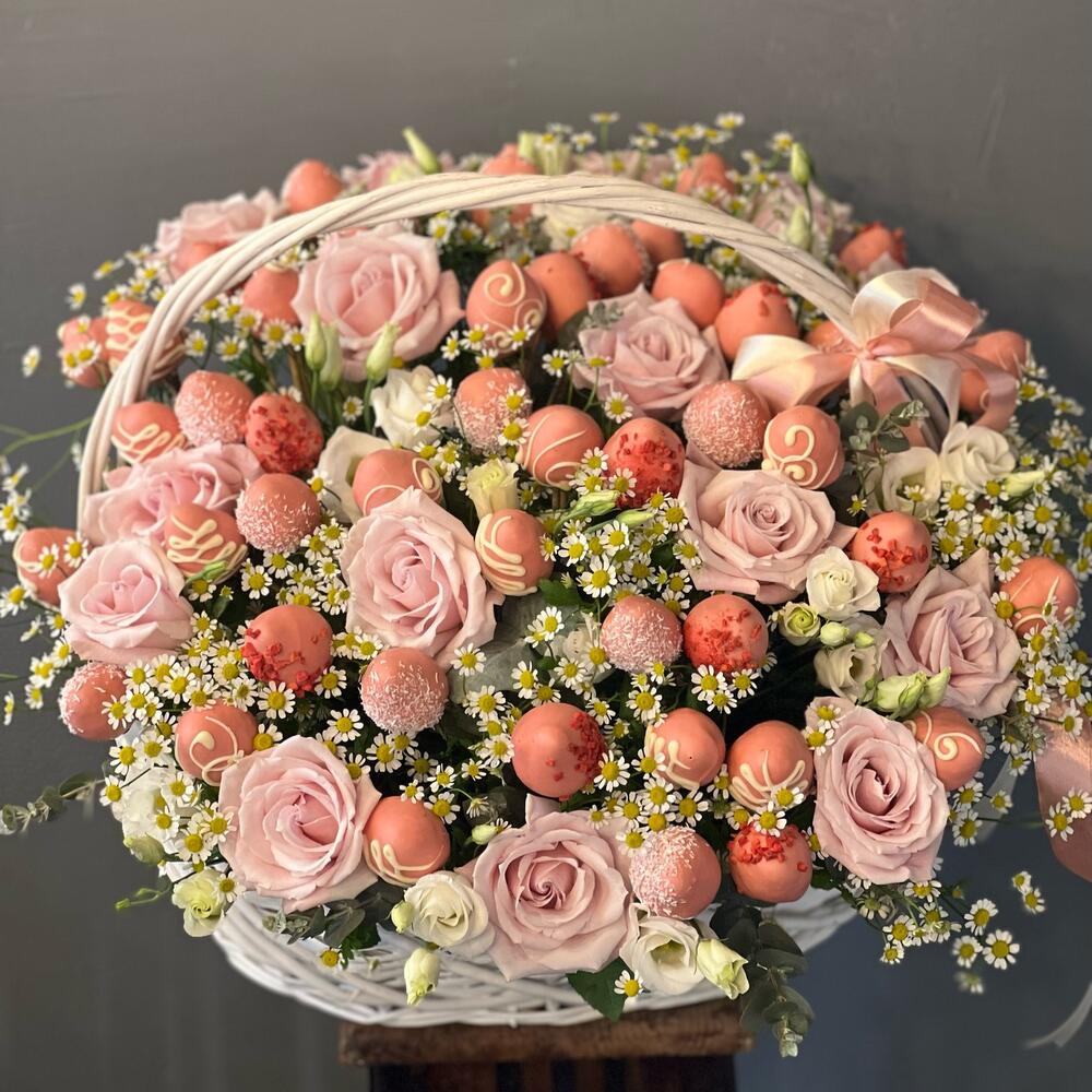 Корзина с клубникой в шоколаде и розами