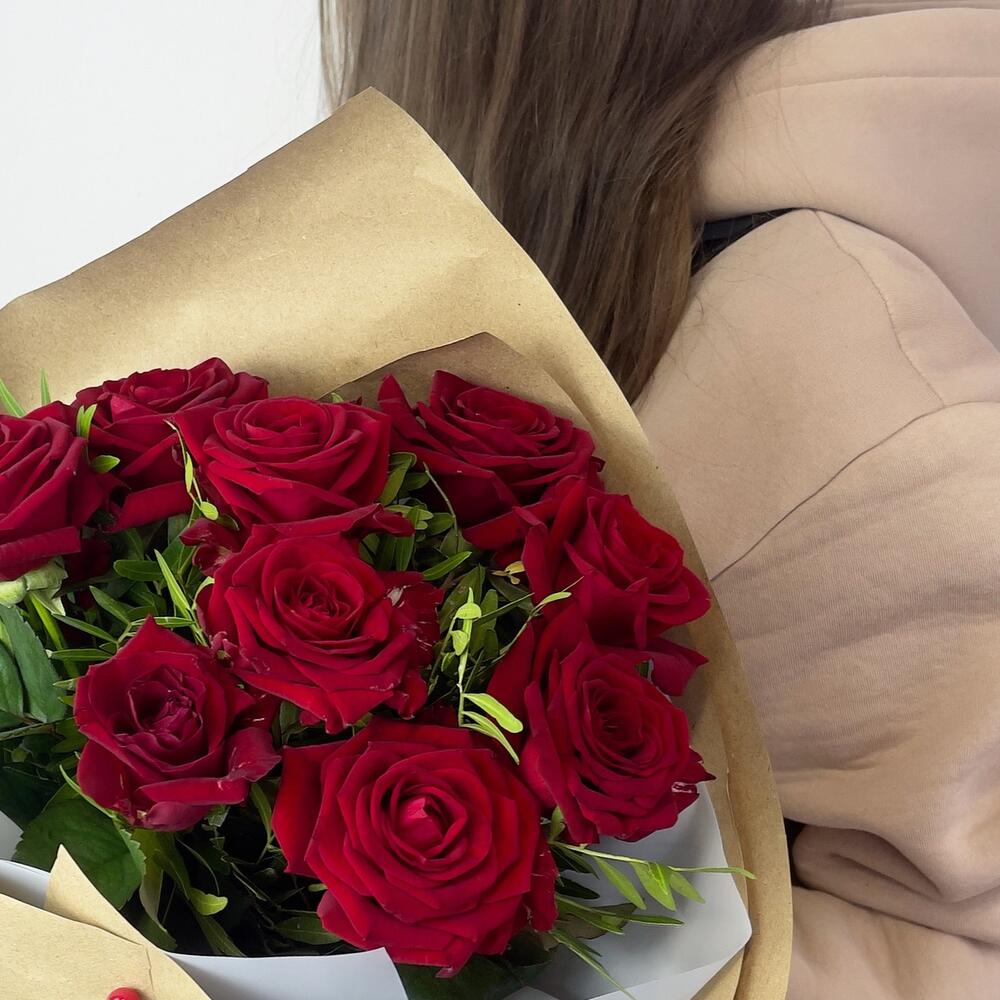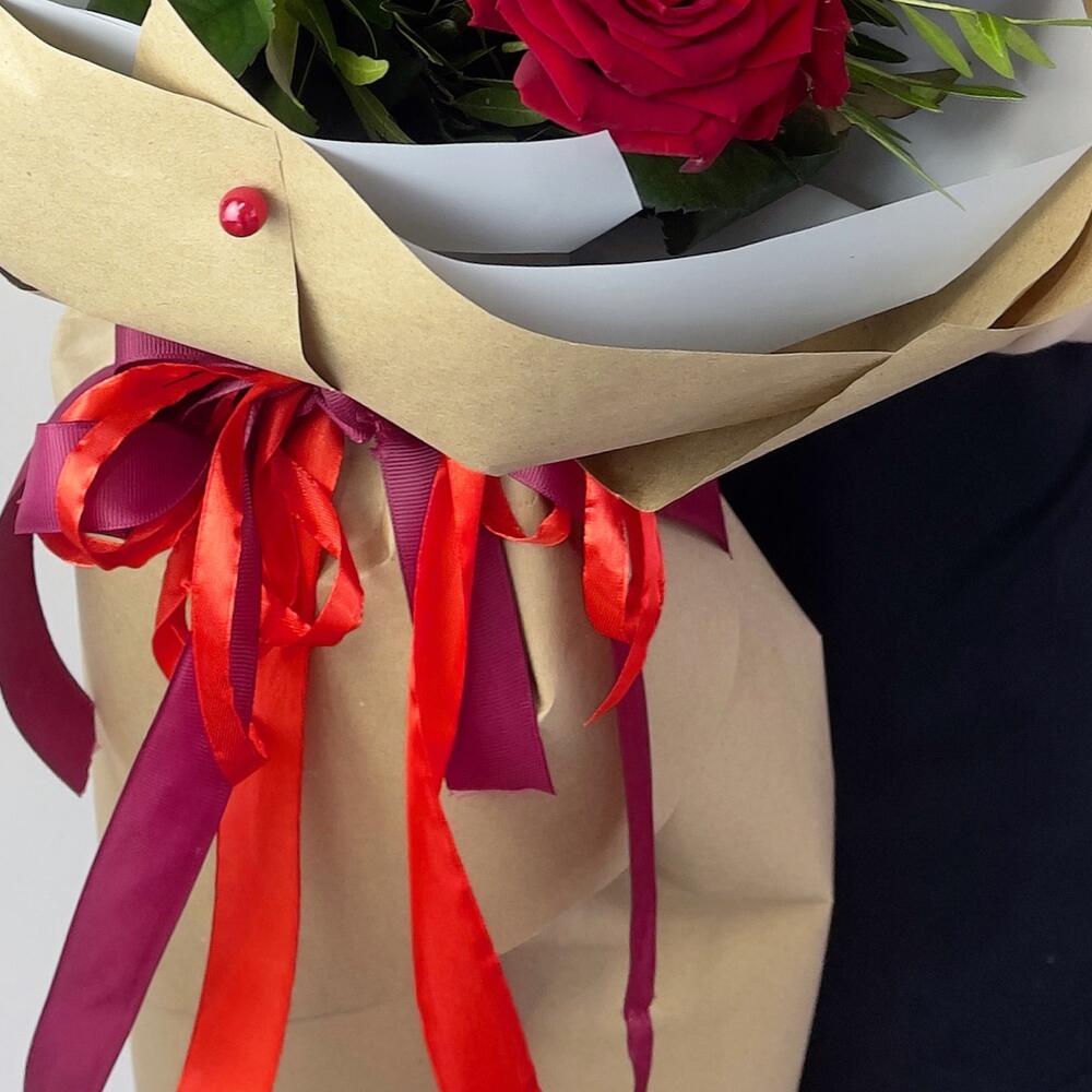 Красная роза россия – 9 шт.Фисташка пучок – 1 шт.Пленка матовая – 2 шт.Крафт упаковка – 6 шт.Лента атласная – 8 шт.булавка жемчуг – 1 шт.