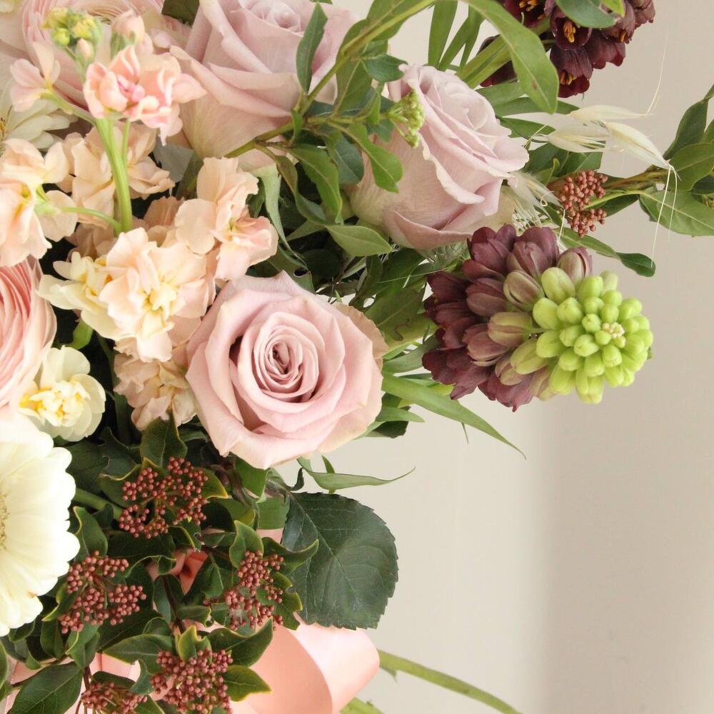 Ранункулюс – 3 шт.Роза сортовая – 5 шт.Гербера – 4 шт.Нарцисс кустовой – 3 шт.Маттиола – 3 шт.вибурнум цветущий – 5 шт.Лента атласная – 1 шт.