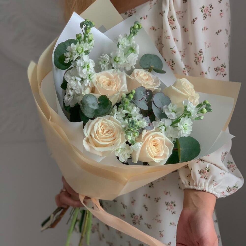 Маттиола белая – 4 шт.роза плая бланка – 5 шт.Эвкалипт Микс – 2 шт.Упаковка дизайнерская – 1 шт.