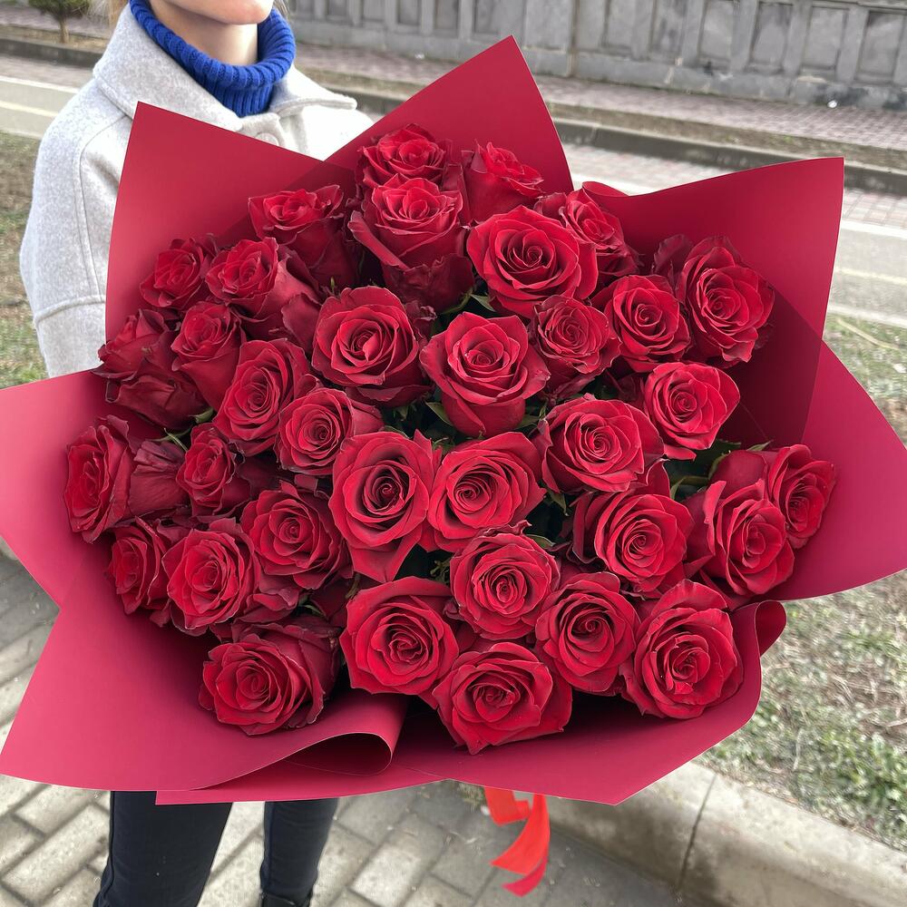 Роза красная – 35 шт. Упаковка – 1 шт. Атласная лента – 1 шт.