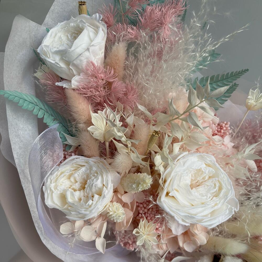 Гортензия – 1 шт.Озотамнус – 2 шт.Папоротник – 1 шт.Рускус – 2 шт.Хлопок – 2 шт.Аспарагус – 1 шт.Упаковка дизайнерская – 1 шт.Роза стабилизированная – 3 шт.Ковыль – 3 шт.Нигелла – 1 шт.Лагурус – 12 шт.Мак – 2 шт.Фаларис – 8 шт.пампасная трава – 1 шт.