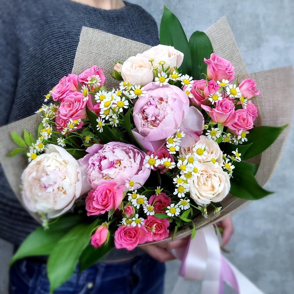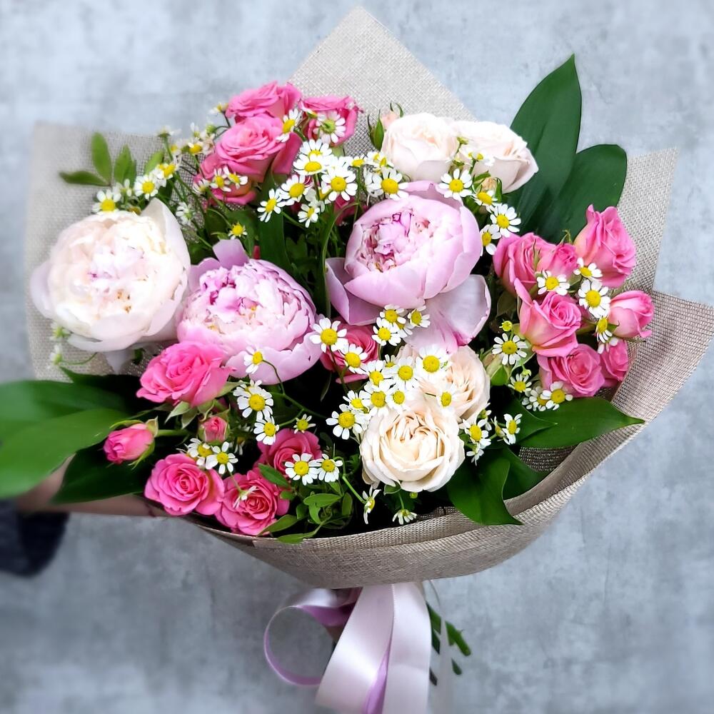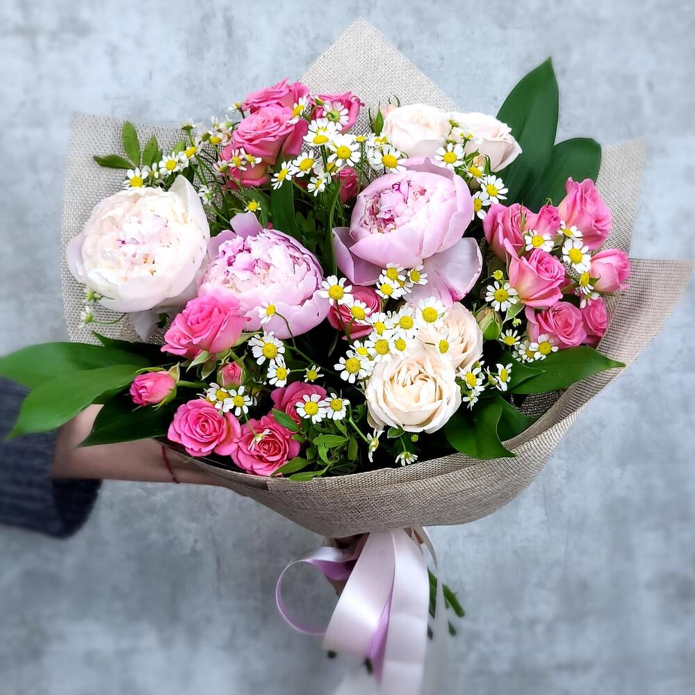 Гвоздики, Кустовые розы, Пионовидные розы, Розы