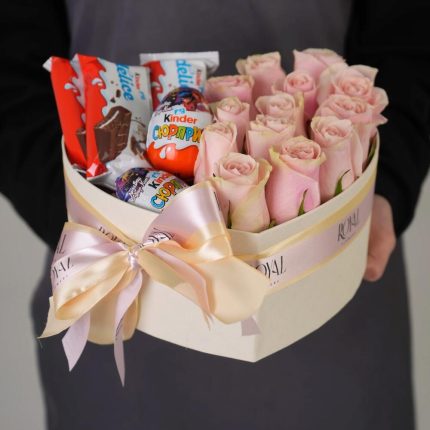 “Сладкое сердце ” – цветочная композиция с сладостями в коробке “Сердце”