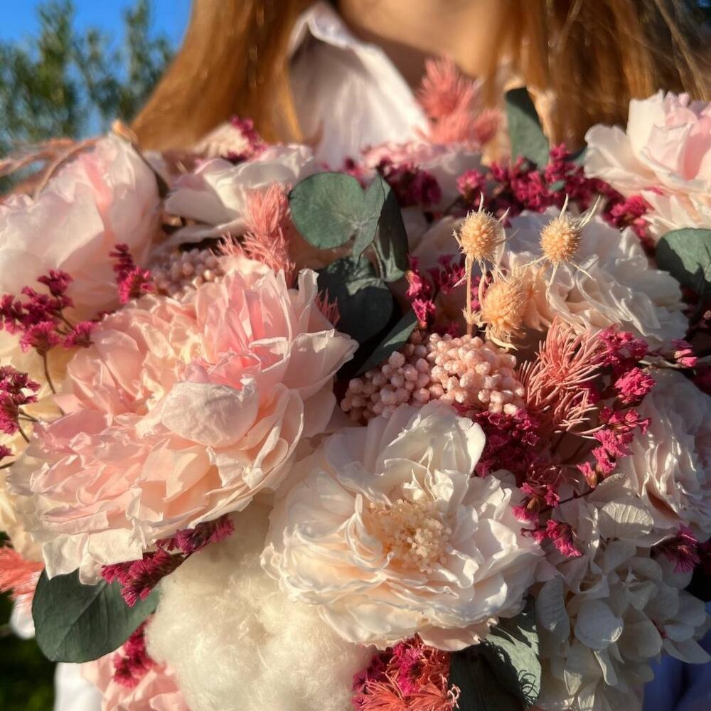Шляпная коробка со стабилизированными пионовидными розами, ароматным эвкалиптом и натуральным хлопком. Не требует ухода, полива и освещения. Не вянет и не изменяет внешний вид больше года