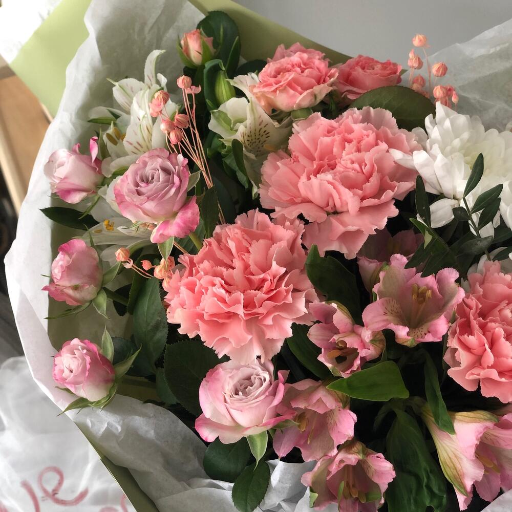 Стильный букет с розами, альстромерией, гвоздиками и хризантемой