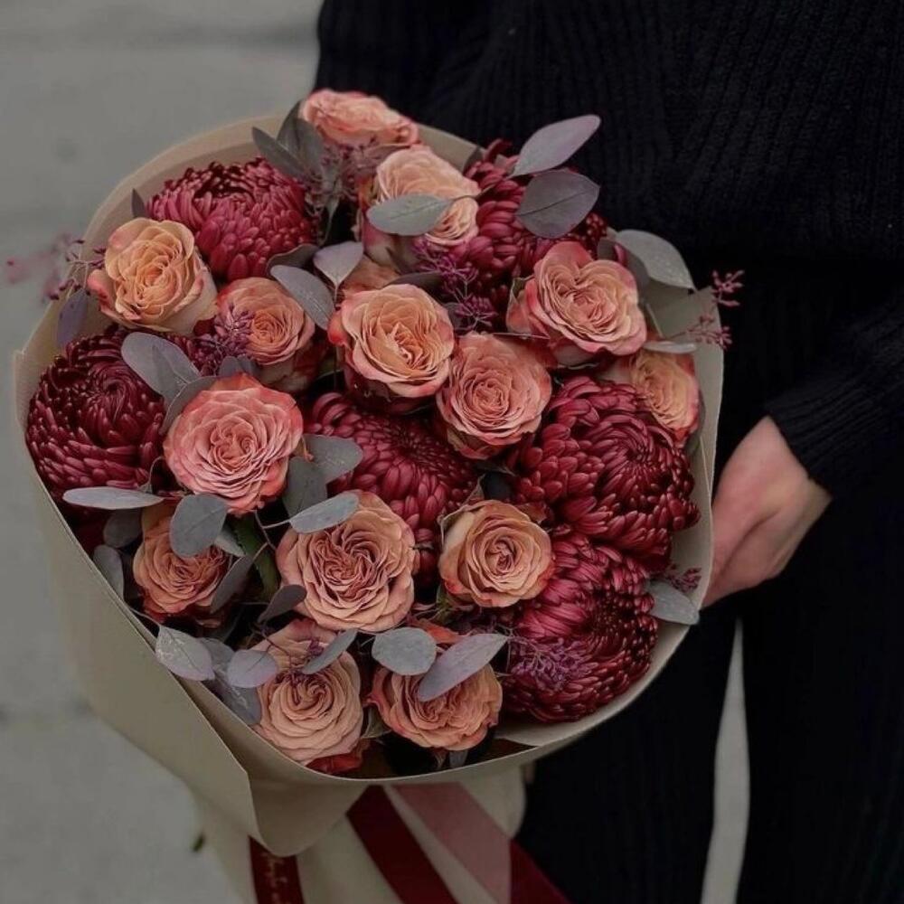 Эвкалипт – 1 шт. Роза – 15 шт. бигуди хризантема – 7 шт.