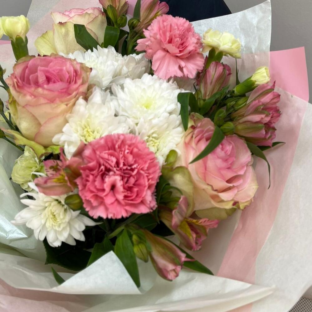 Роза – 3 шт.Диантус – 3 шт.Альстромерия – 3 шт.Хризантема – 1 шт.Диантус кустовой – 3 шт.Тишью – 2 шт.Авторская упаковка – 1 шт.Лента атласная – 1 шт.