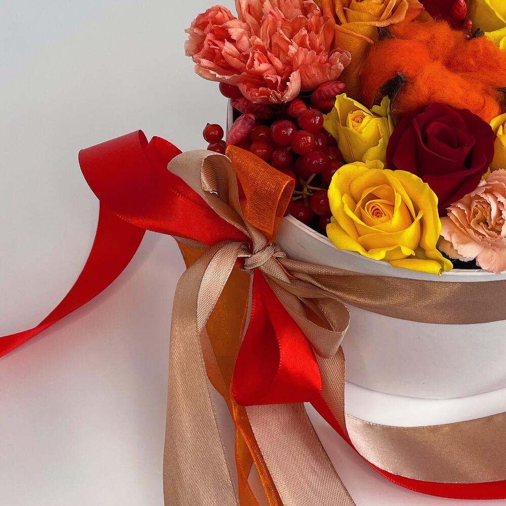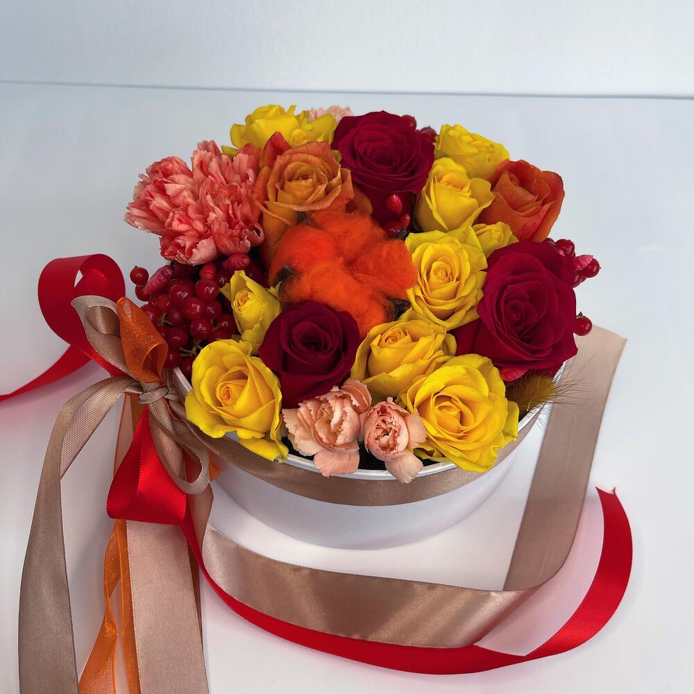 Хлопок – 1 шт.Кустовая роза – 2 шт.Лента атласная – 6 шт.Диантус – 1 шт.Коробка – 1 шт.Красная роза – 3 шт.Диантус кустовой – 1 шт.Калина красная – 1 шт.