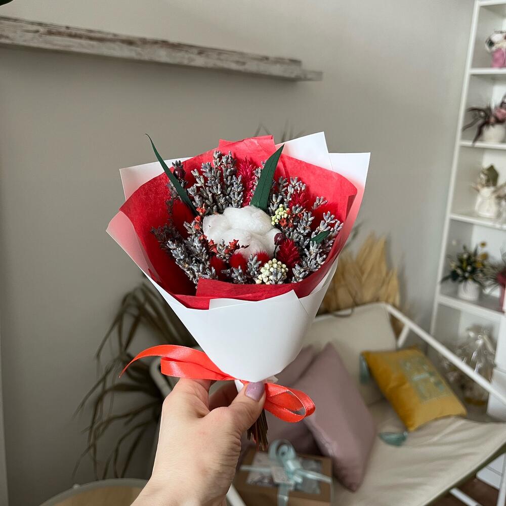 Лаванда – 45 шт.Хлопок – 1 шт.Лагурус – 6 шт.Фаларис – 3 шт.Эвкалипт стабилизированный – 3 шт.