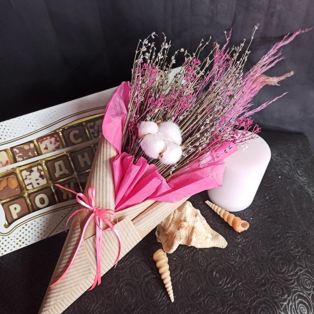 Лаванда (сухоцвет) пучок – 1 шт.Хлопок натуральный – 1 шт.гипсофила радужная – 1 шт.Упаковка дизайнерская – 2 шт.Лента атласная – 2 шт.