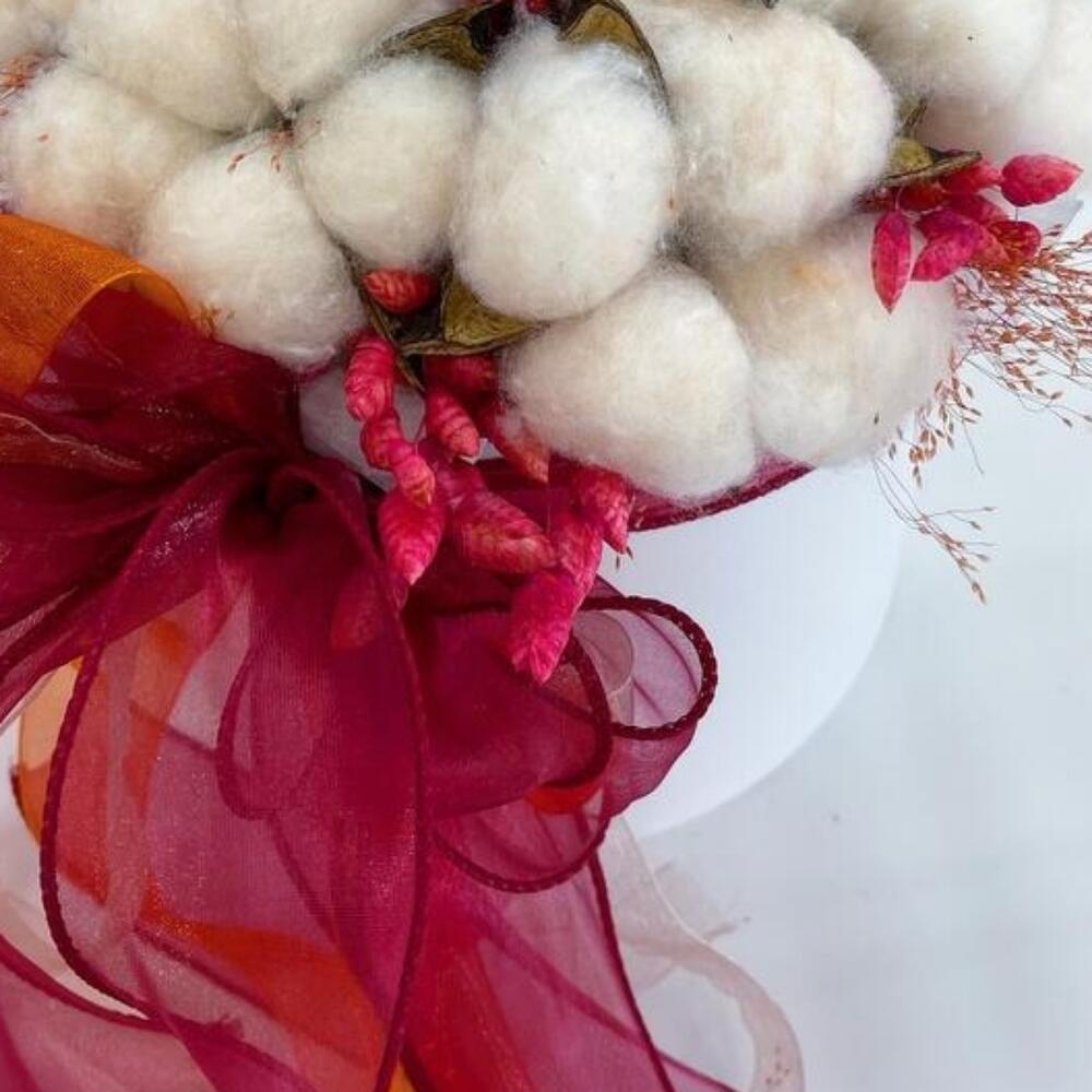 Яркая композиция из хлопка в коробке с сухоцветами идеально подойдёт в качестве подарка или для интерьера в доме .