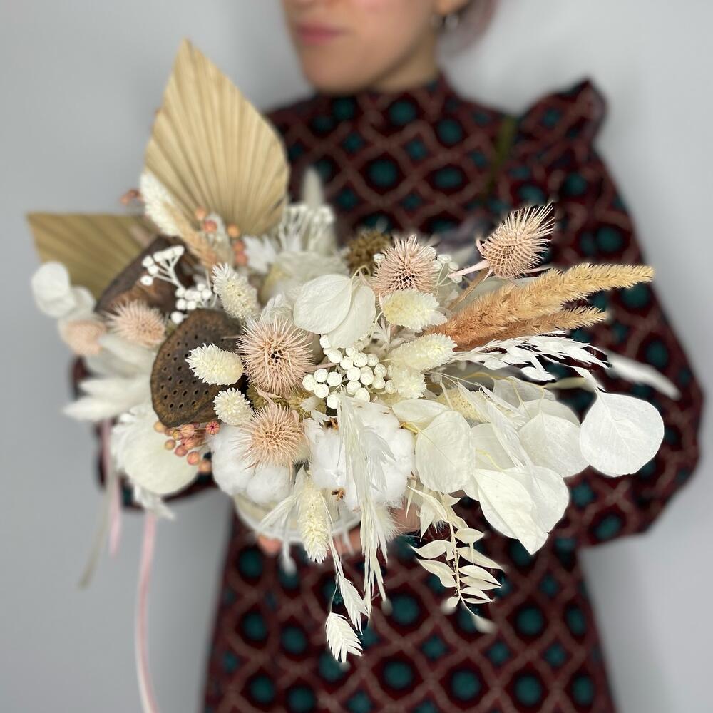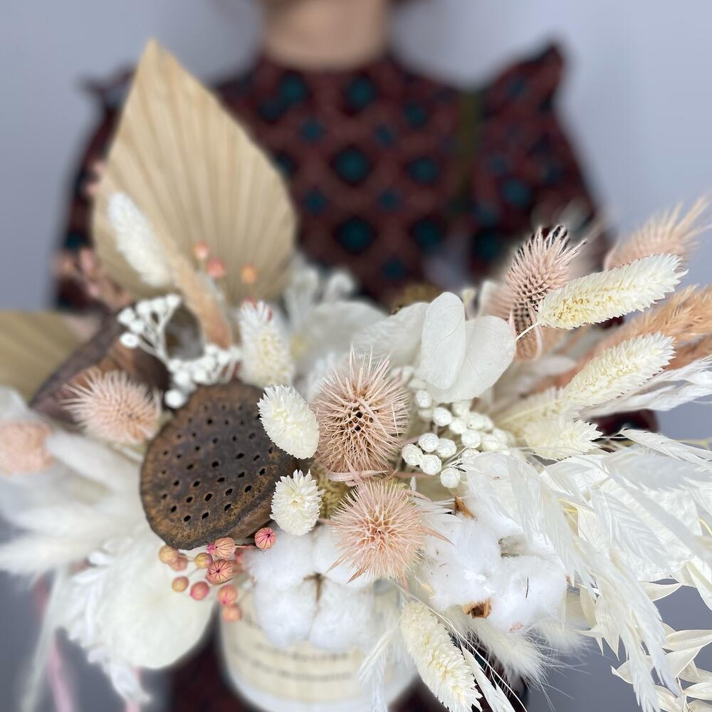 Кашпо металлическое – 1 шт.Оазис флористический – 1 шт.лист пальмы сухоцвет – 2 шт.лотос коробочка – 2 шт.эрингиум сухоцвет – 5 шт.Хлопок натуральный – 3 шт.фаларис сухоцвет – 23 шт.Лагурус – 31 шт.пижма сухоцвет – 3 шт.Эвкалипт стабилизированный – 4 шт.папоротник стабилизированный – 1 шт.лен сухоцвет – 6 шт.Колоски – 3 шт.рускус сухоцвет – 1 шт.вейник сухоцвет – 5 шт.Лента атласная – 2 шт.