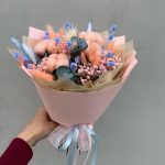 Красивый приятный, Нежный персиково-голубой букет. С добавлением эвкалипта и гипсафилы. Все материалы натуральные не осыпаются.
