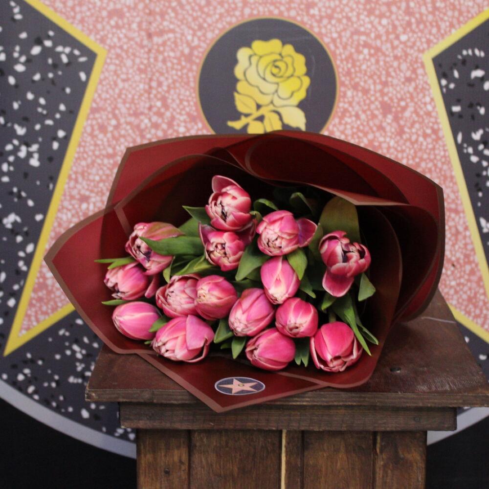 тюльпан пионовидный коламбус – 15 шт.Пленка дизайнерская – 2 шт.Лента атласная – 1 шт.