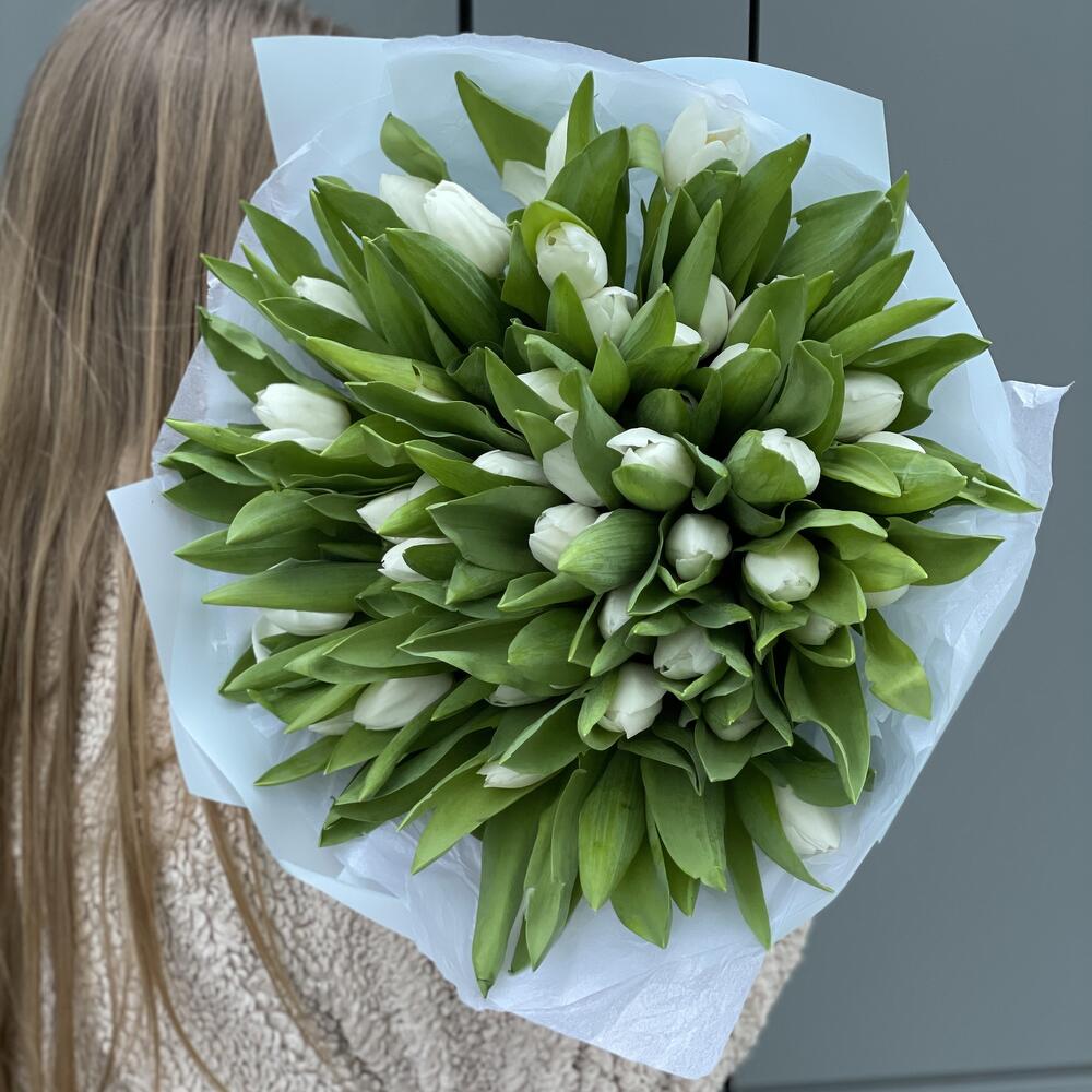 Букет из 51 белоснежного тюльпана сорта Royal Vergin в оформлении!