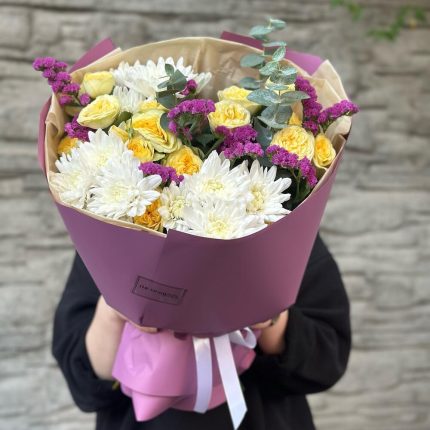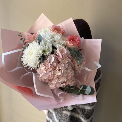 Хризантемы и Пионовидные кустовые розы в коробке + открытка ручной работы в подарок